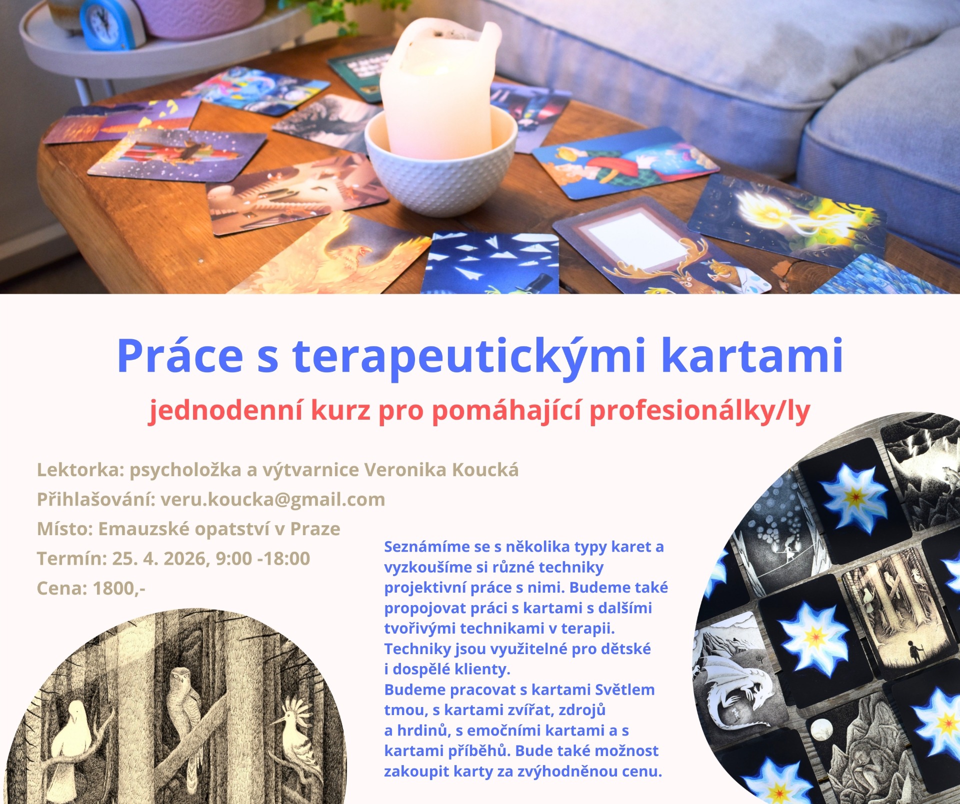 V Ateliéru Jen sen vznikly nové karty, které spojují mé dvě práce, výtvarnou a terapeutickou. Karty jsou kreslené tuší, na spodní straně je barevná hvězda. V balíčku je také příručka s mnoha nápady pro použití a kartičky se slovy a s barvami.